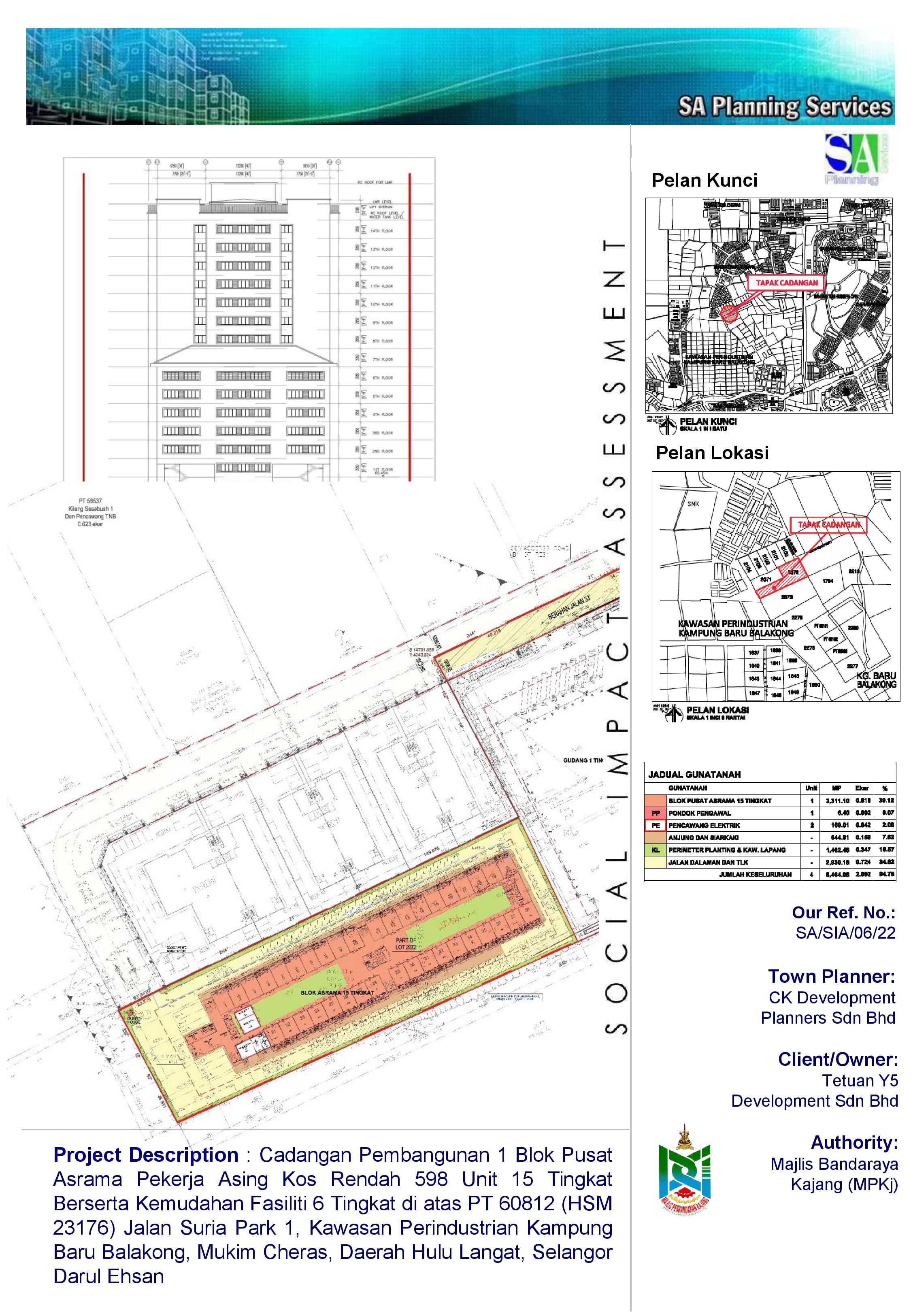 Kajian Penilaian Impak Sosial (SIA) Bagi Cadangan Membina 1 Blok Pusat Asrama Pekerja Asing Kos Rendah 598 Unit 15 Tingkat Berserta Kemudahan Fasiliti 6 Tingkat Di Atas Pt 60812 (Hsm 23176), Jalan Suria Park 1, Kawasan Perindustrian Kampung Baru Balakong, Mukim Cheras, Daerah Hulu Langat, Selangor Darul Ehsan